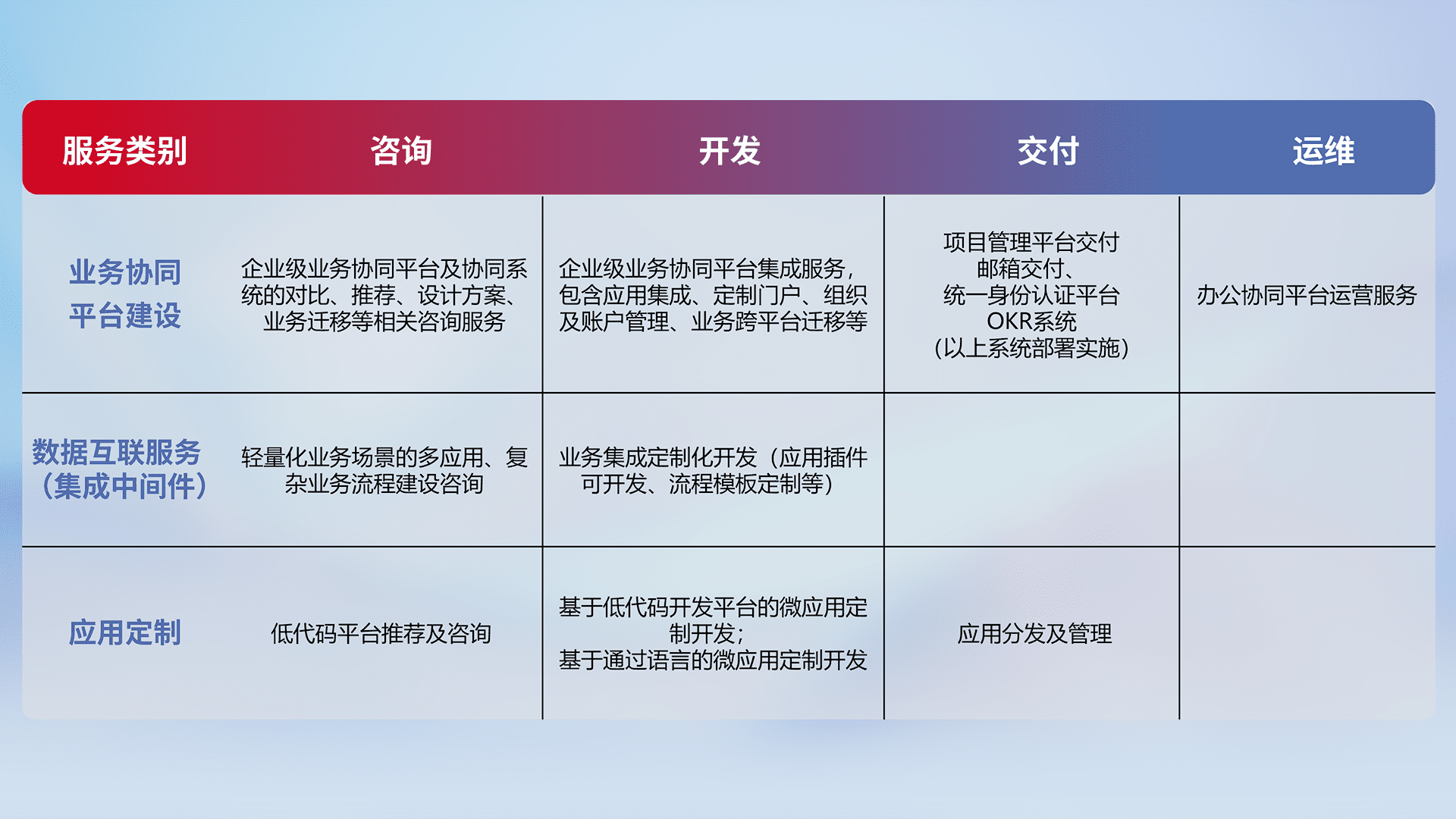 针对钉钉、、企微、、、、IDaas等平台级产品提供产品的规划、、方案、、、交付、、、定制化开发等服务,,,,实现如统一协同办公、、、智能客户服务、、、混合会议管理、、智能数据查询、、、等业务场景,,实现数字化转型。。。