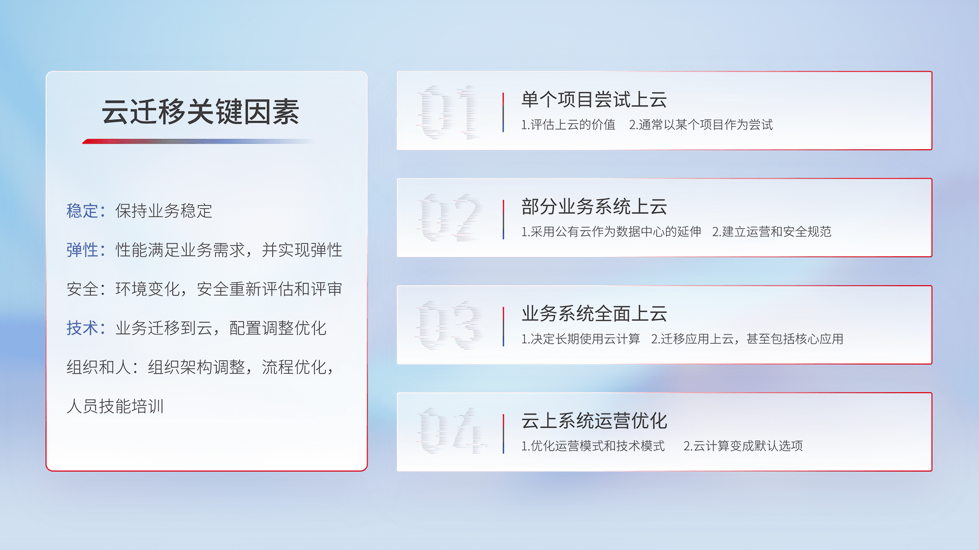 结合实际业务,,,,从规划设计、、云平台选型、、云原生改造、、、、数据迁移、、、、集成交付,,迁移全过程为客户识别最佳上云路径,,做好风险识别管理,,,设计网络架构、、、、身份权限、、、、安全审计合规、、操作审计、、日志审计、、、监控告警策略、、多站点容灾设计等,,对云上基础设施进行整体规划,,,提升IT治理水平,,,,以满足弹性、、高可用、、、、高性能的需求。。