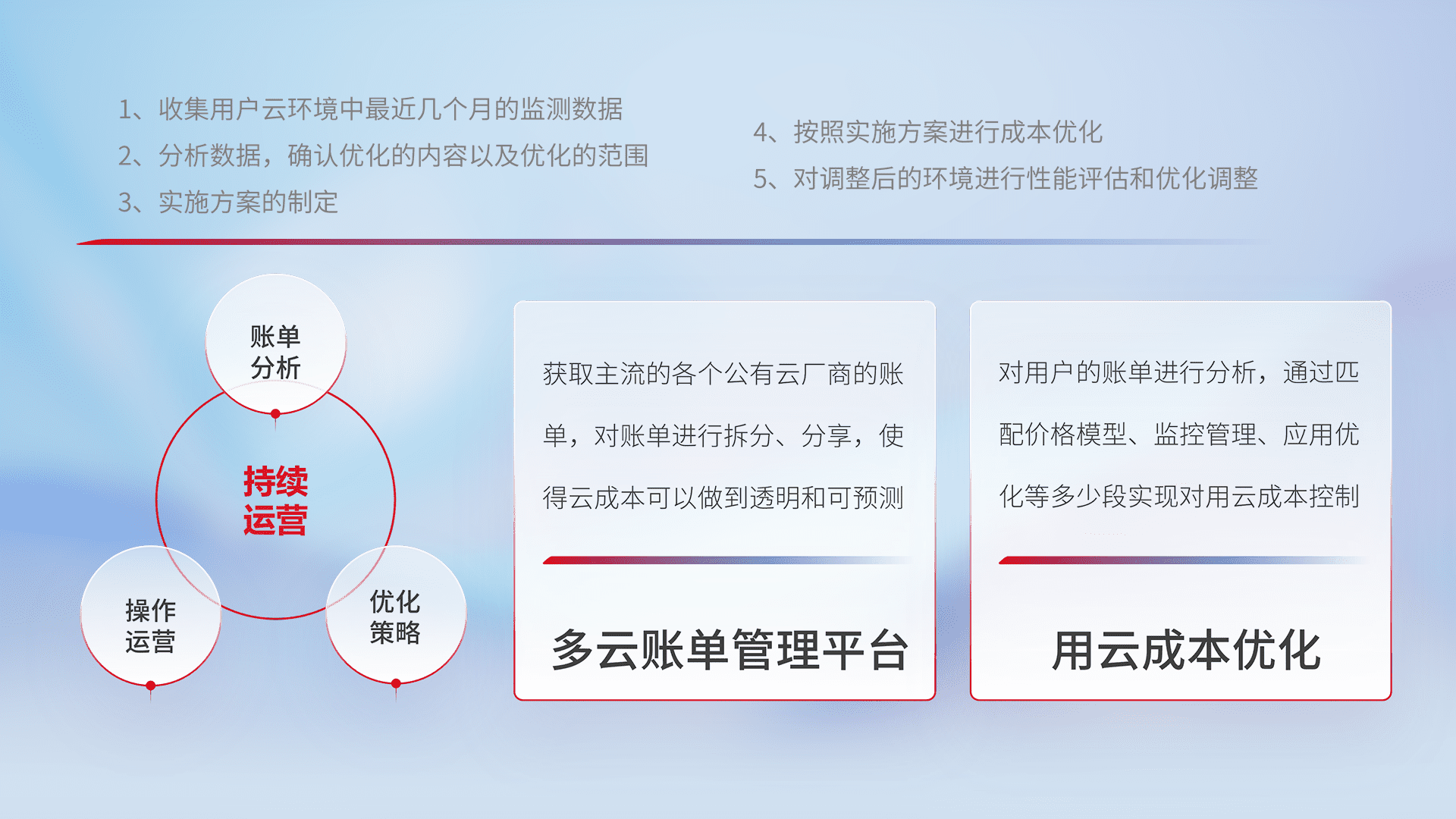 通过多云纳管,,,,以统一的资源数据模型把客户的云资源进行抽象和封装,,,进而实现对多云资源的统一操作,,,保障云资源管理的可靠性、、、稳定性与可用性。。。。量身定制化运维内容,,,配置、、开发运维、、、、补丁管理、、备份、、监控、、认证和访问管理、、、审计和日常巡检等,,保障在用云过程中的可靠度,,稳定度以及高可用率。。