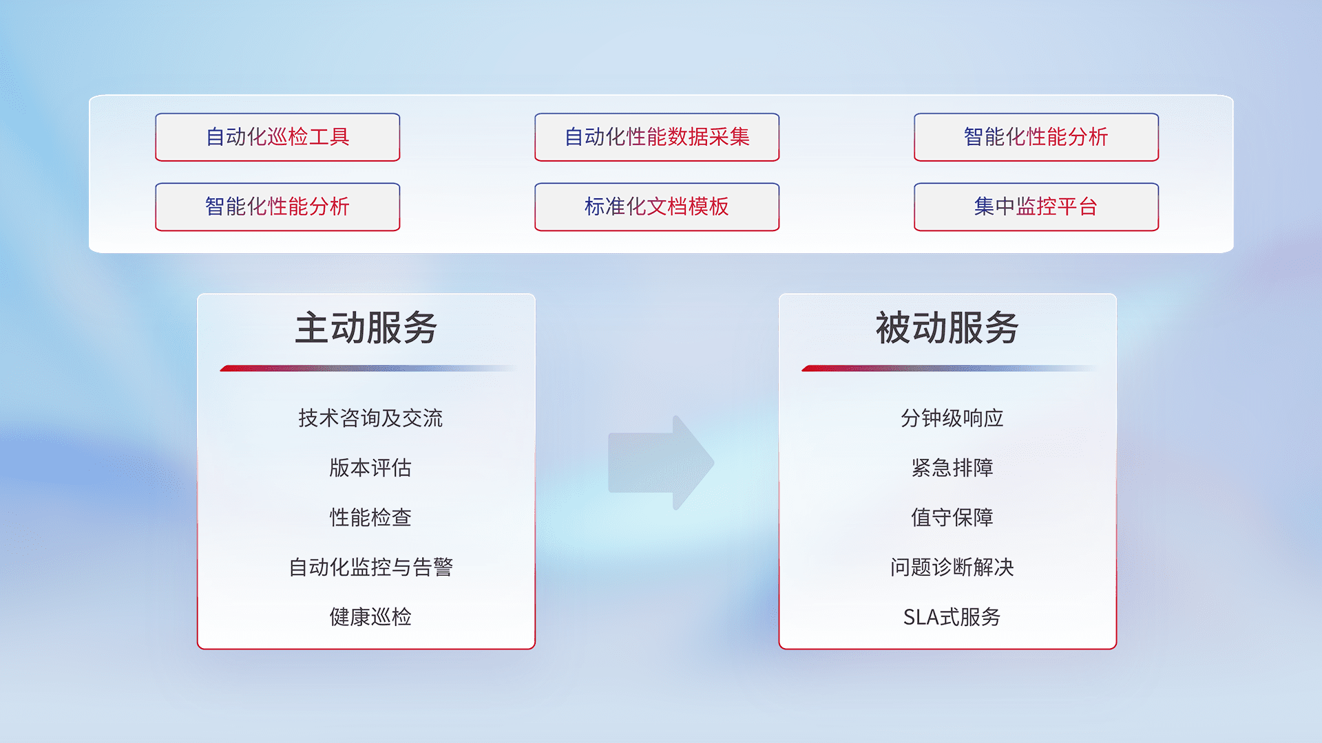 智能化工具和标准化文档,,,,保障服务质量,,提供主动服务(包含技术咨询、、、版本评估、、性能检查、、自动化监控与告警、、健康巡检)和被动服务包含(分钟级响应、、紧急排障、、、值守保障、、、、问题诊断解决、、、SLA服务)。。。
