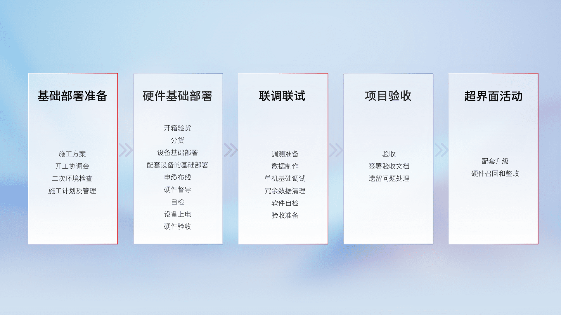 从基础部署准备、、、、硬件基础部署、、、联调联试、、项目验收、、、越界面活动的全过程可追溯,,保证施工质量和进度。。。。